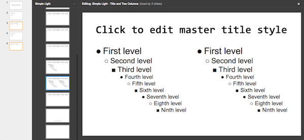 使用 Google 幻灯片创建演示文稿时,可以从预先设计的幻灯片主题背景和布局中进行选择。您还可以对这些主题背景和布局进行编辑,从而能够在整个演示文稿中重复使用自定义的幻灯片设计。